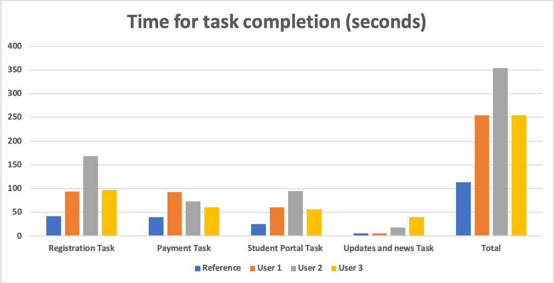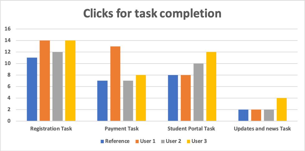 The gap between high user time to task completion and relatively normal number of clicks is an interesting finding. This may be explained by over-cluttered screens, especially in the path of task 1 (registration)