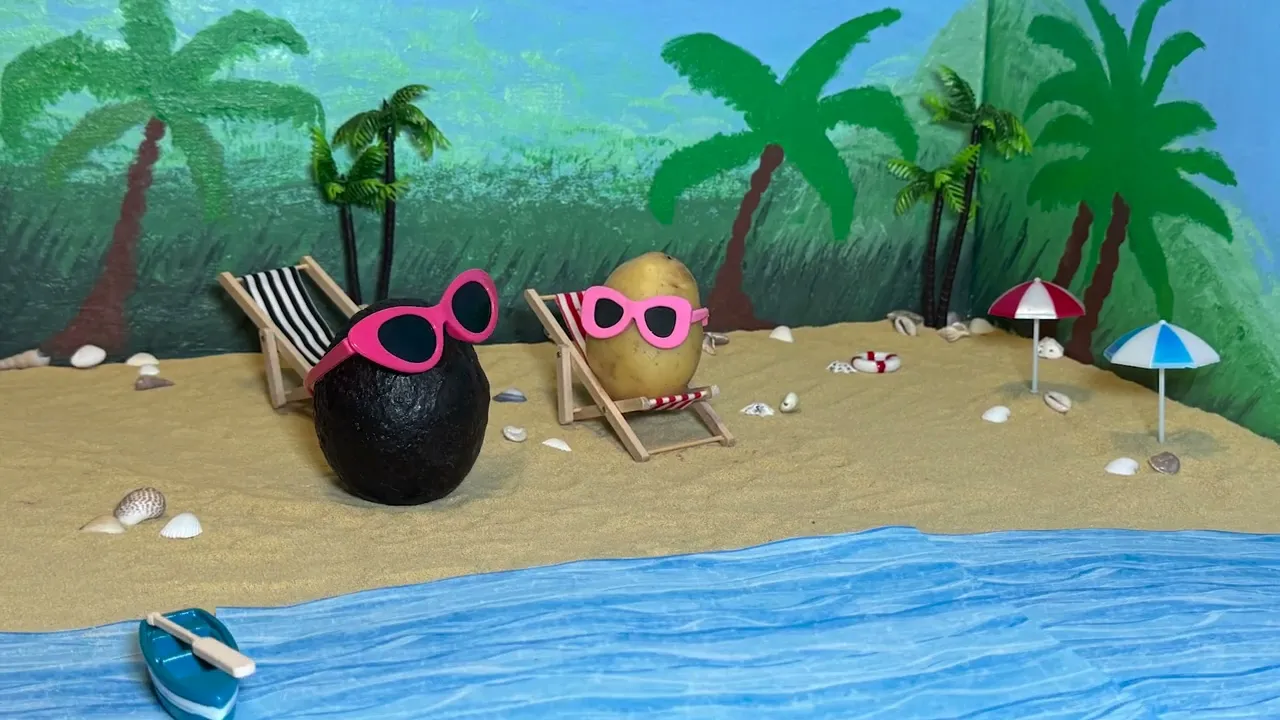 The physical set was carefully designed to be clearly visible yet not overcrowded. Materials included sand, a scaled folding beach chair, and other ambiance elements like paper waves, a boat, beach umbrellas, and a little turtle. Vegetables, such as tomatoes and oranges, were used to represent different kinds of people at the beach. All of them were dressed as humans, wearing common beach accessories.