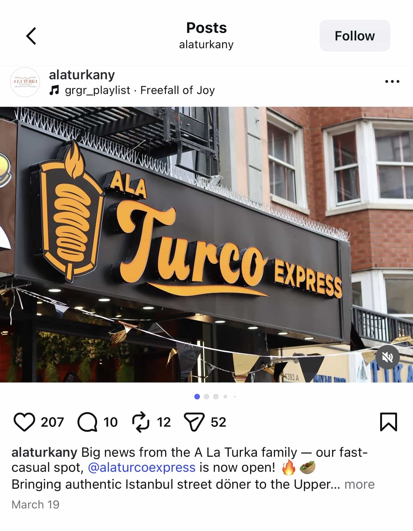 Instagram post of “A La Turka”, Turkish restaurant in Manhattan, announcing a new fast food service. Image taken from instagram "A la Turka Restaurant"