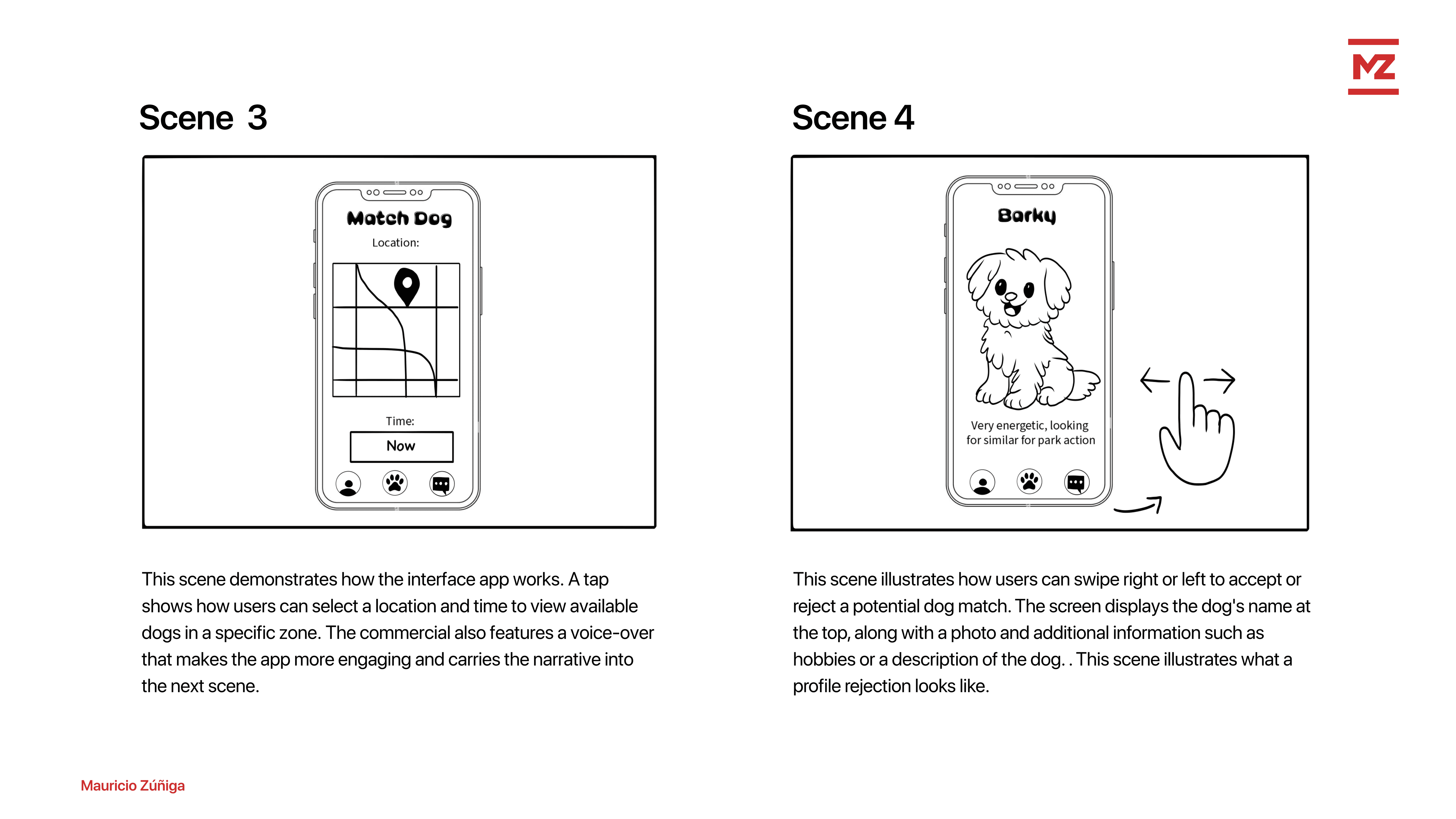 Through the storyboards, I outlined a screen plan for home/discovery, dog profiles, match, and chat/meet-up. Additionally, I prepared a narrator “topic list” to keep the script focused on the app's purpose, functionality, humor, uniqueness, and a call to action.