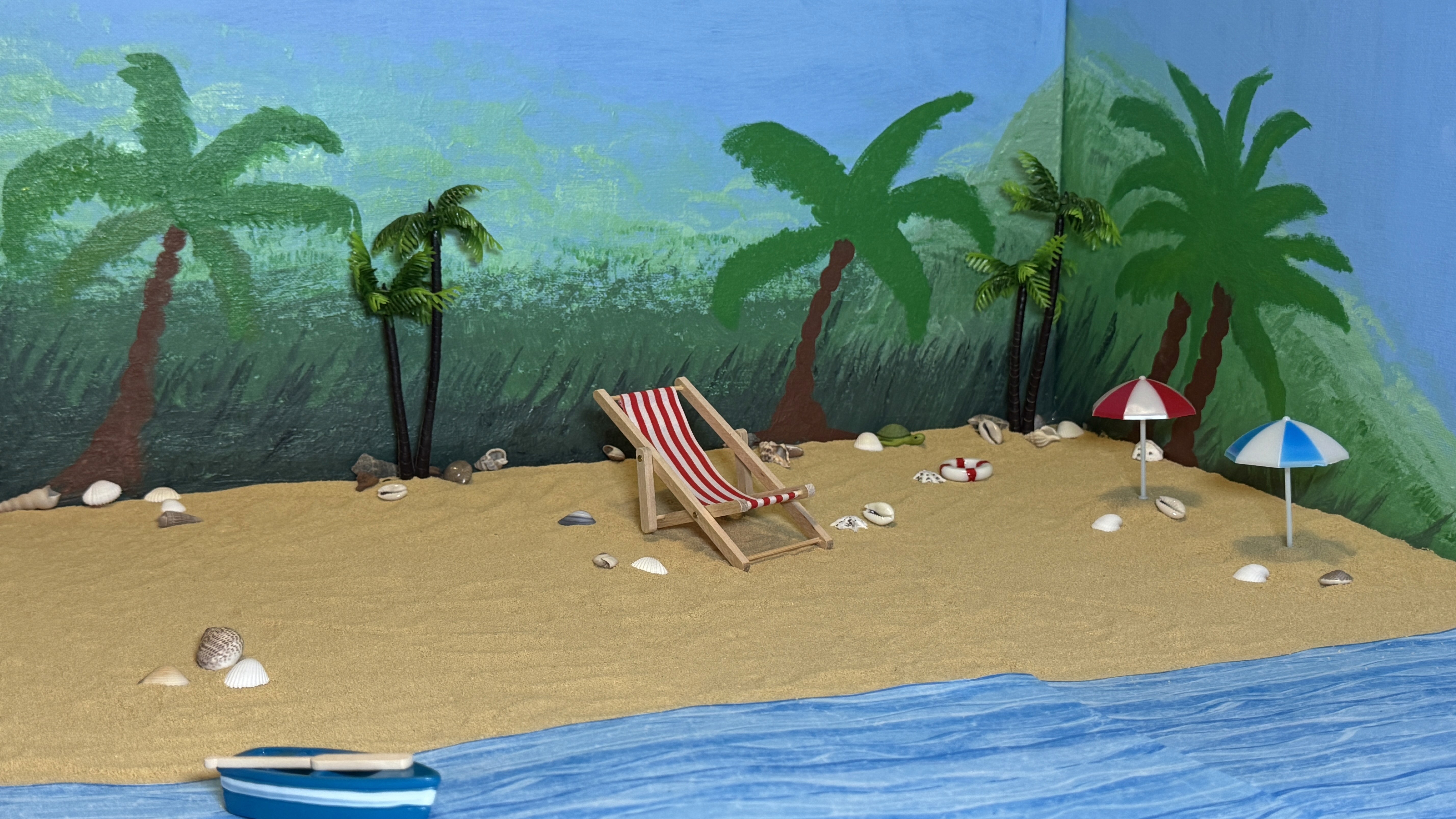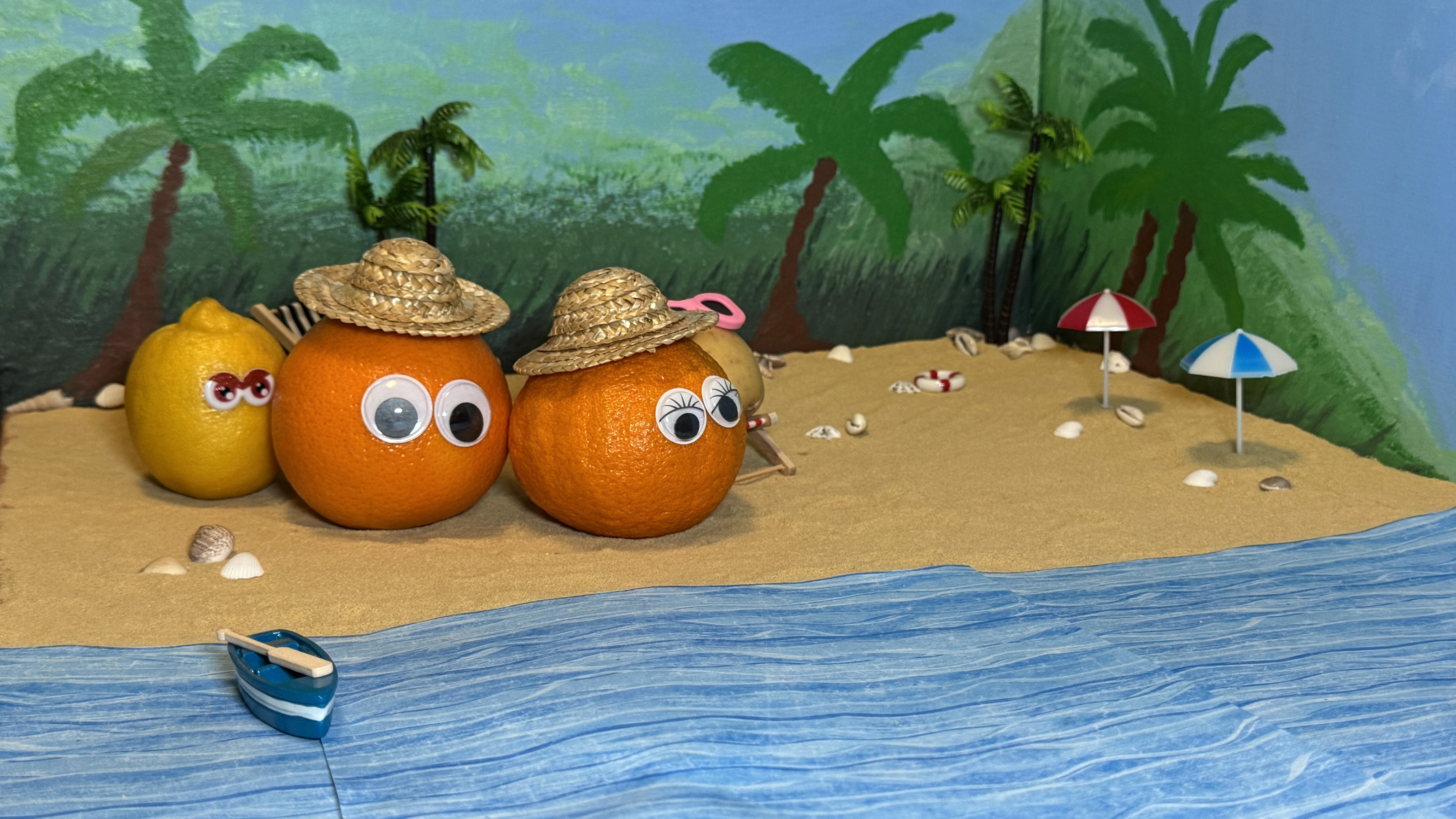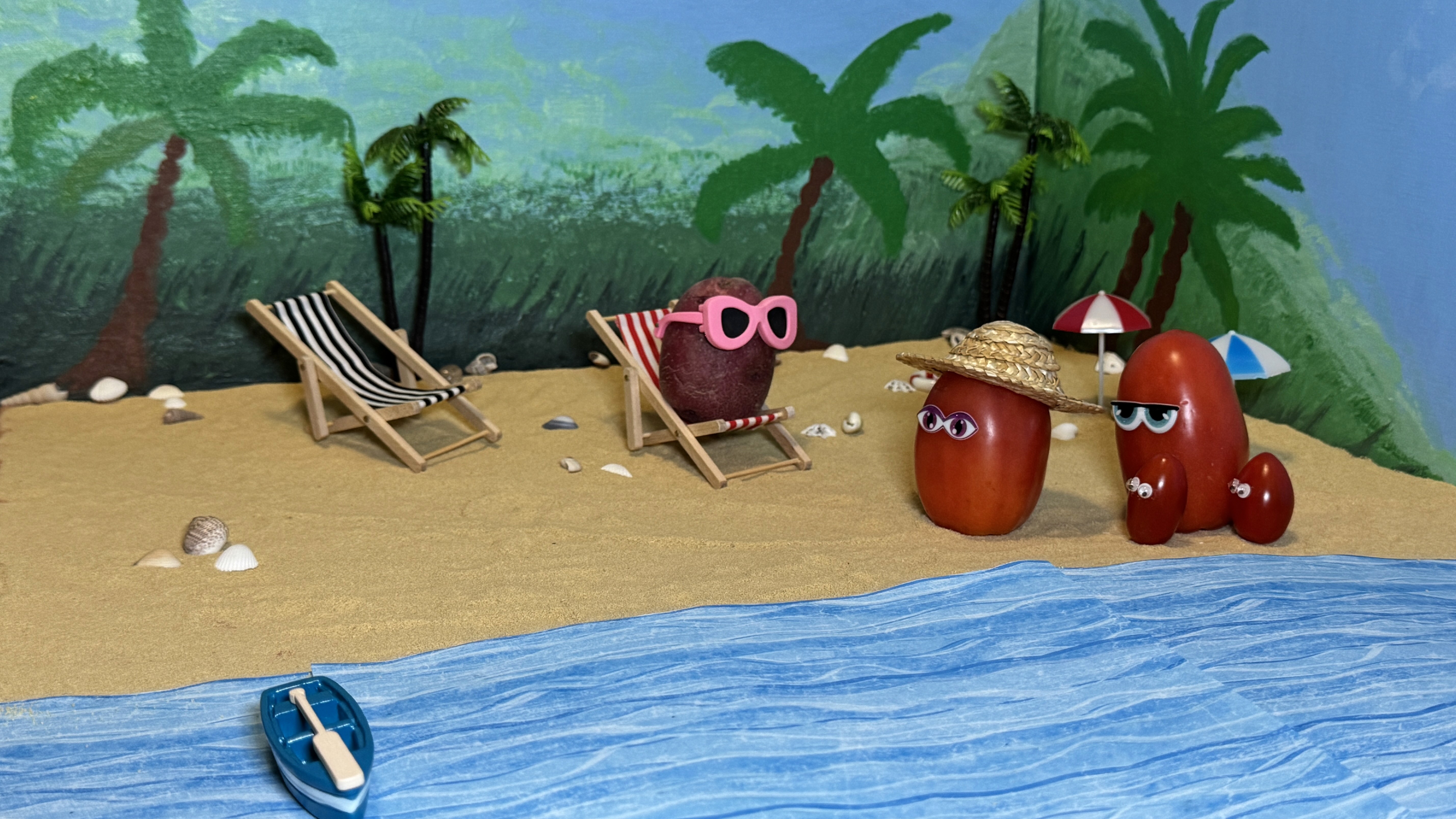 The physical set was carefully designed to be clearly visible yet not overcrowded. Materials included sand, a scaled folding beach chair, and other ambiance elements like paper waves, a boat, beach umbrellas, and a little turtle. Vegetables, such as tomatoes and oranges, were used to represent different kinds of people at the beach. All of them were dressed as humans, wearing common beach accessories.