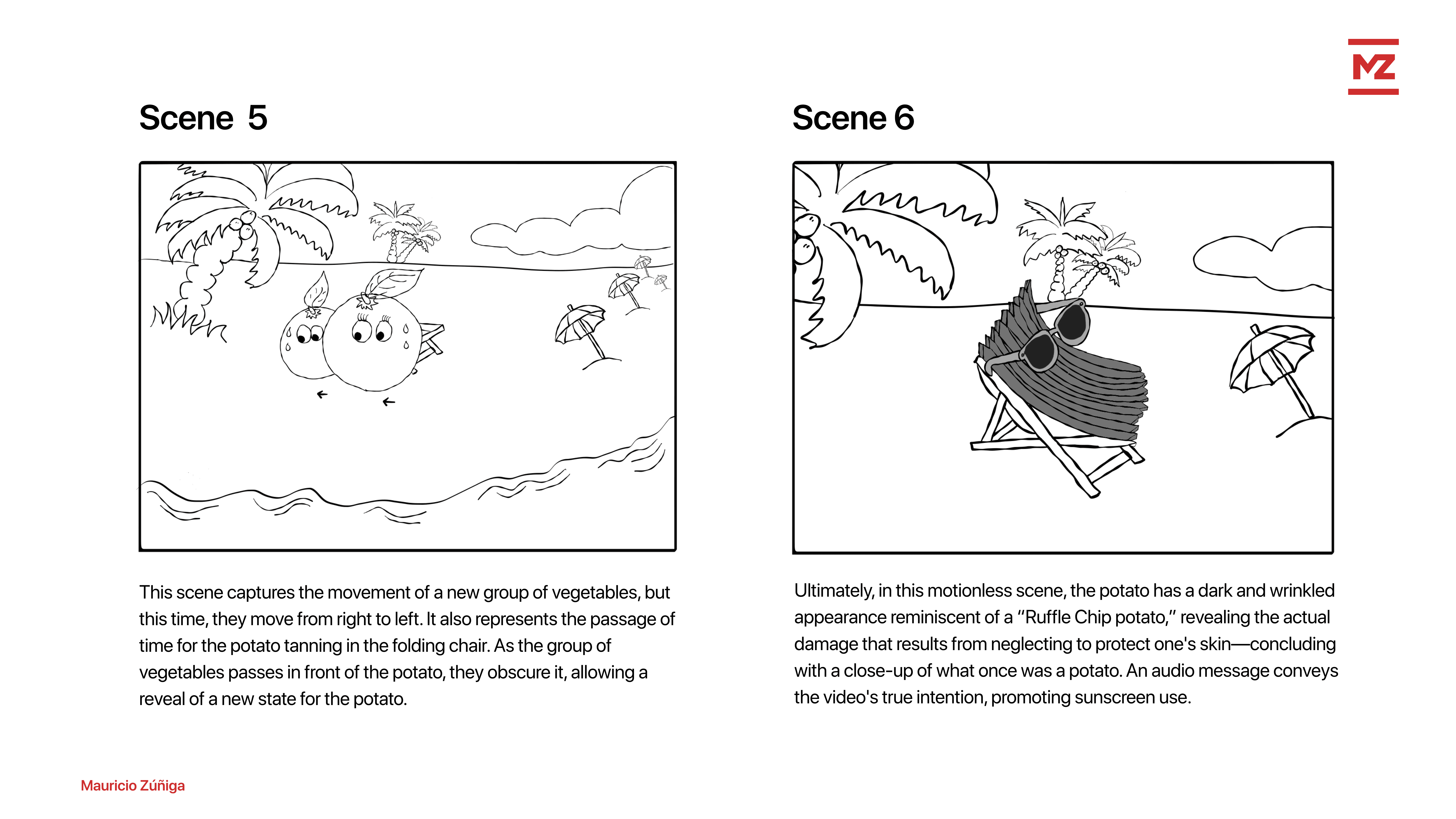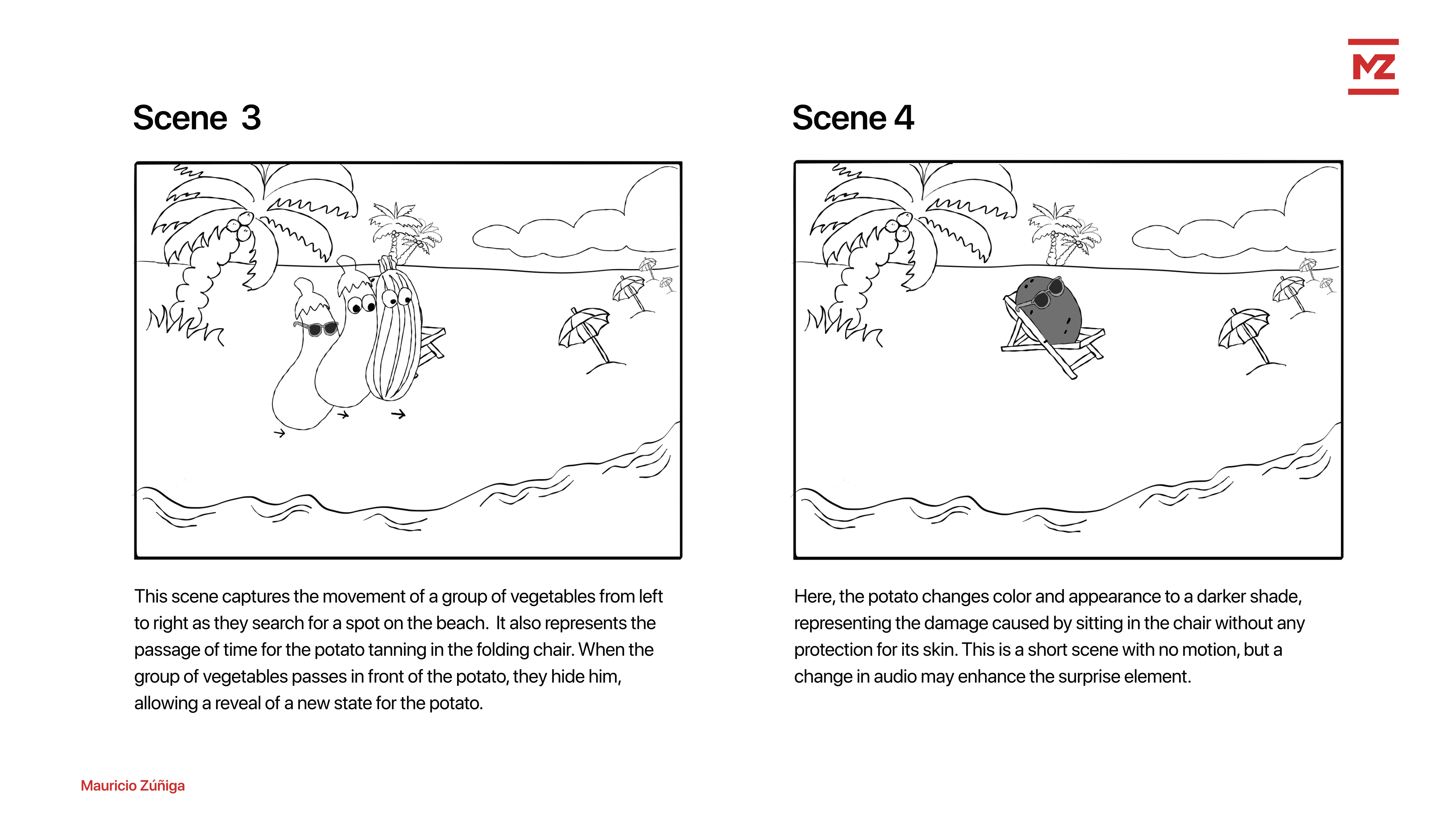 The first step was a written synopsis of the product. This included a draft of the sequence of events, dividing the study into four major scenes that correspond to the main character's state: potato, sweet potato, chips, and end message.