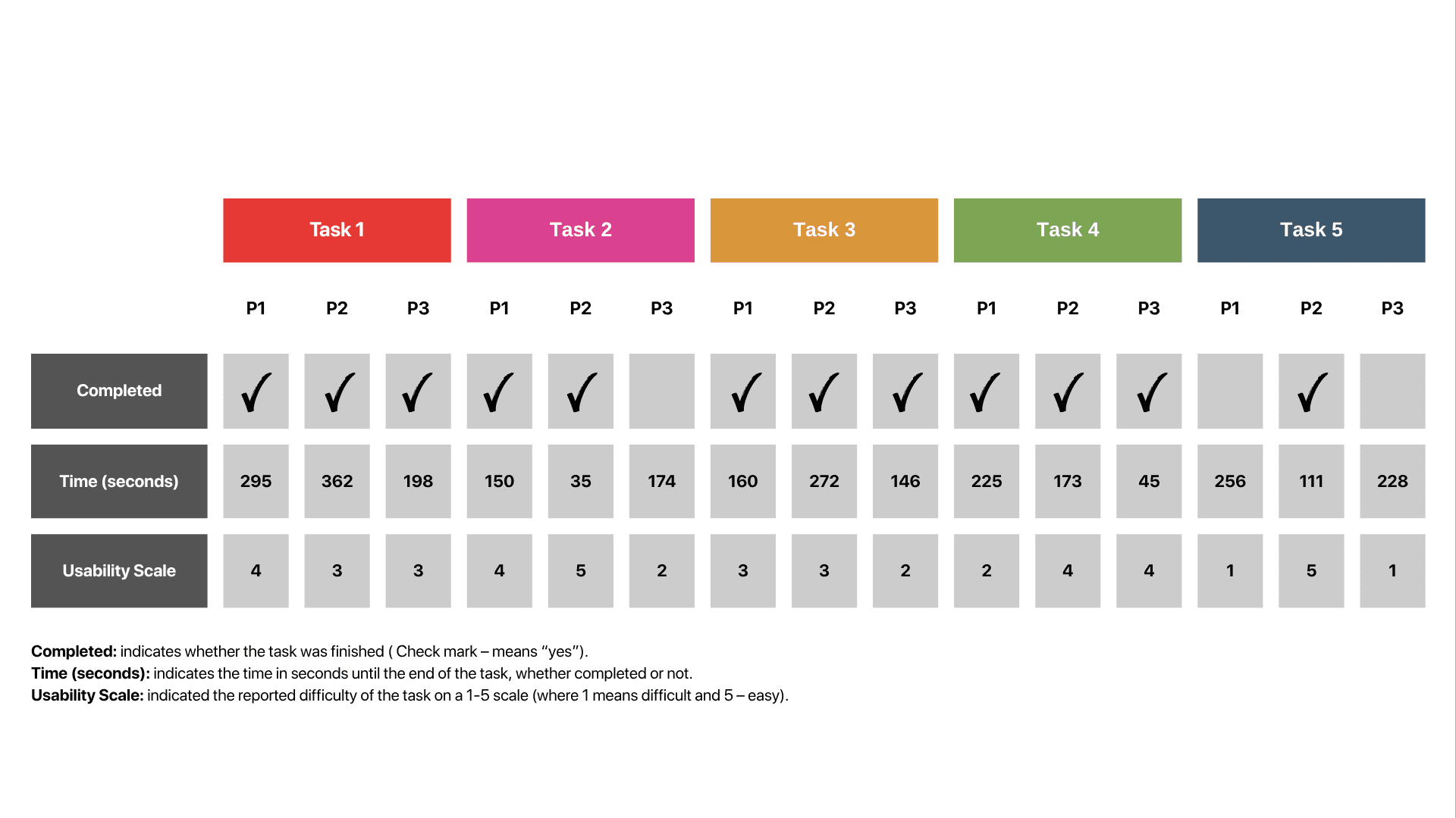 Not all three users completed all five tasks, as shown in this graphic. Tasks #2 and #5 highlighted usability issues that prevented users from reaching the goal.