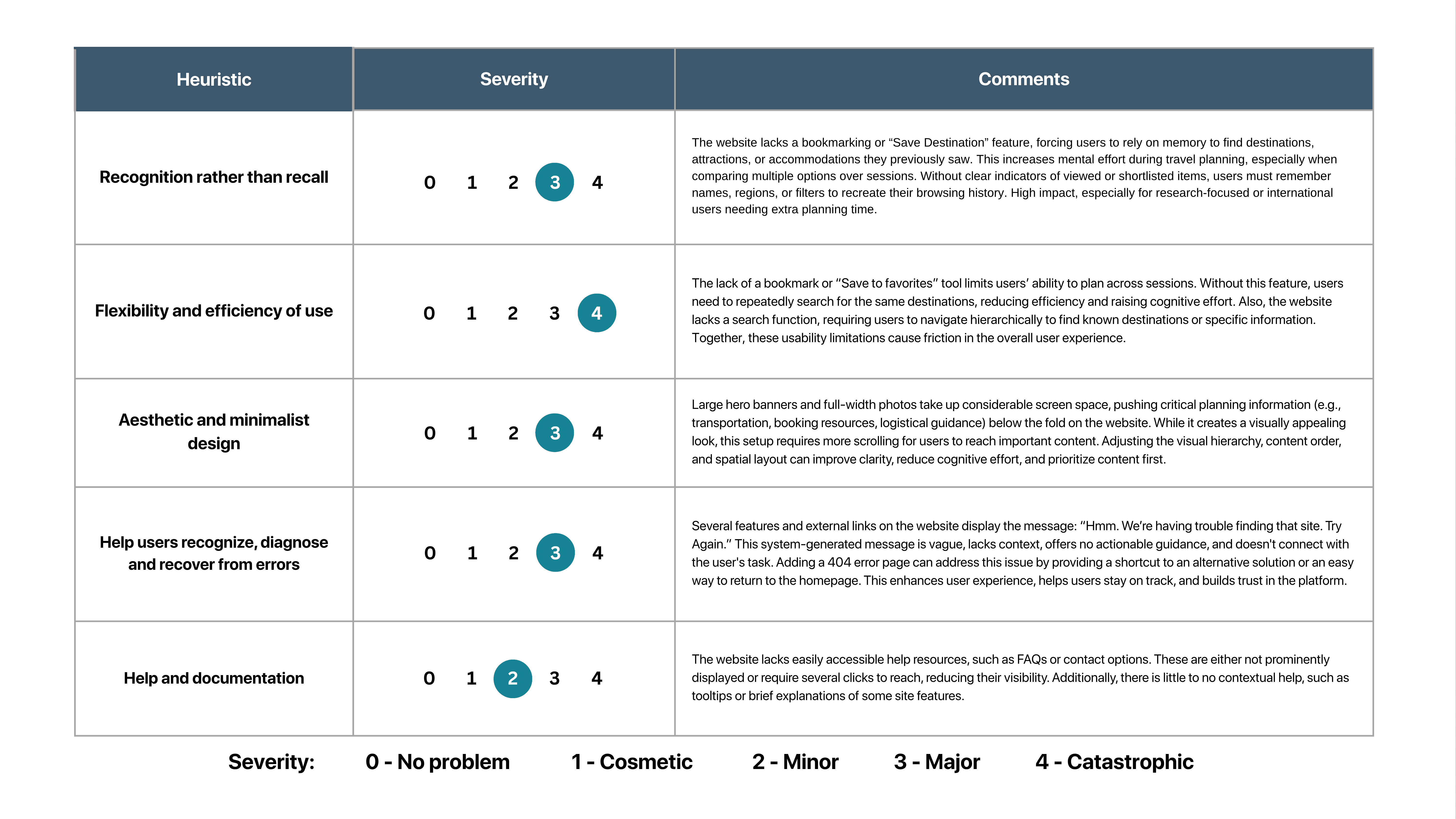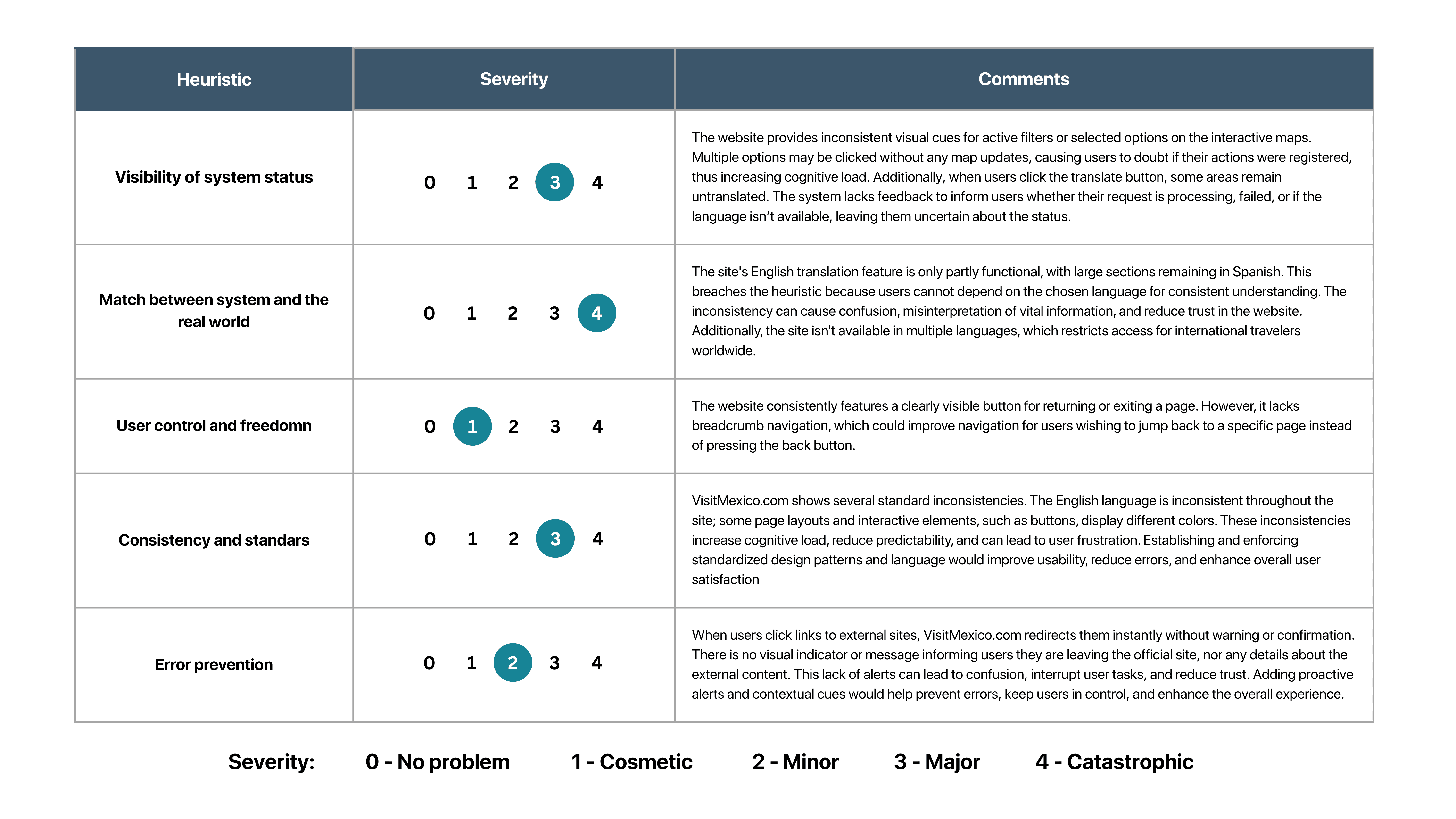 Visitmexico.com was examined using Jakob Nielsen's 10 usability heuristics to identify design issues before user testing. As the sole evaluator, I thoroughly explored the live English website and rated each heuristic's severity on a scale from 0 (no problem) to 4 (catastrophic).