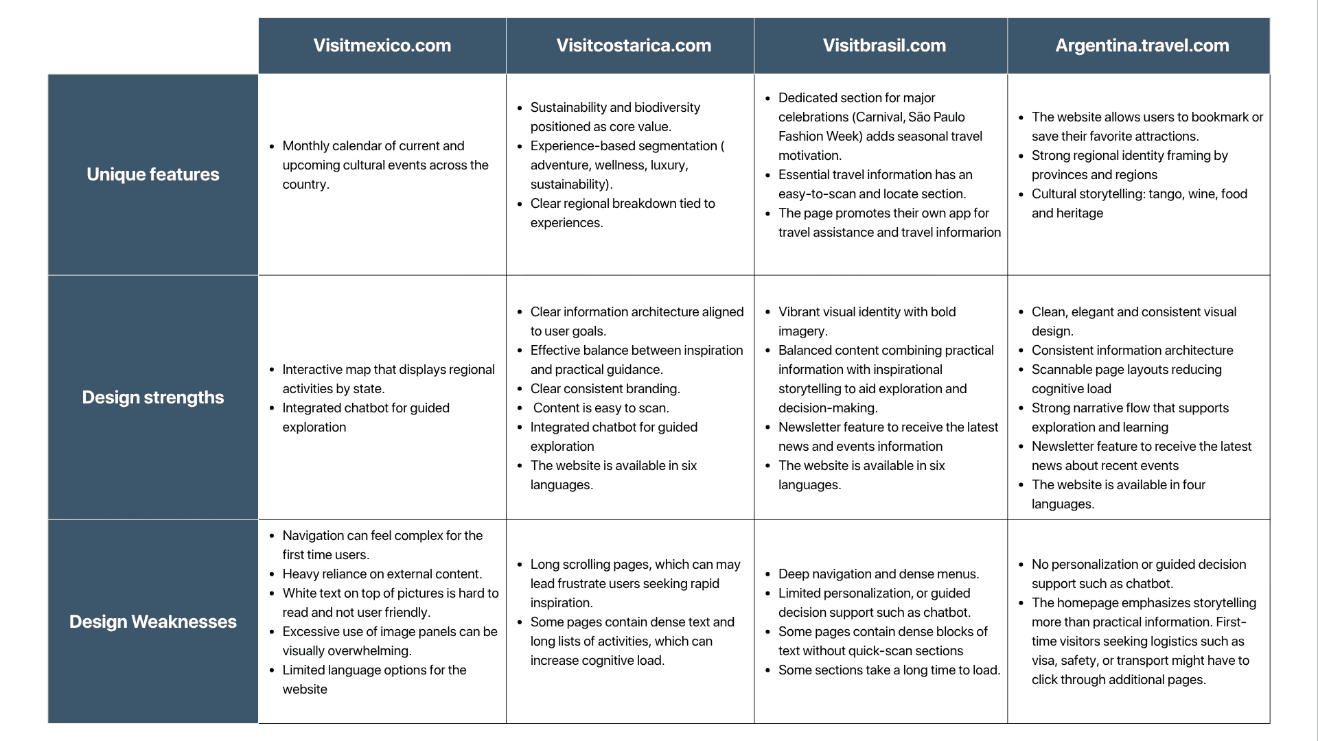 A comparative analysis of regional tourism websites, such as Visit Costa Rica, Visit Brazil, and Argentina Travel, identified industry best practices. Competitors generally offer clearer information, more languages, and better visuals. They also feature helpful tools like bookmarking, newsletters, chatbots, and itinerary planning.